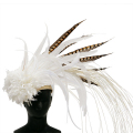 全体をふんわりしたイメージの白いフェザーでまとめ、茶色いキジ羽をアクセントに加えました。